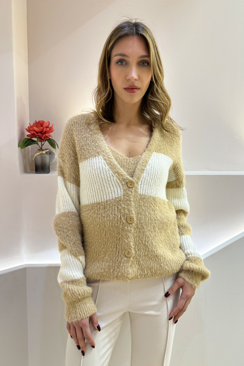 Ce gilet doux et moelleux associe un motif rayé graphique à une coupe confortable et féminine. Il se ferme sur le devant par une rangée de boutons ton sur ton et présente un col V flatteur. Idéal pour superposer sur un t-shirt ou une chemise, il est parfait pour une allure casual-chic en toute saison.