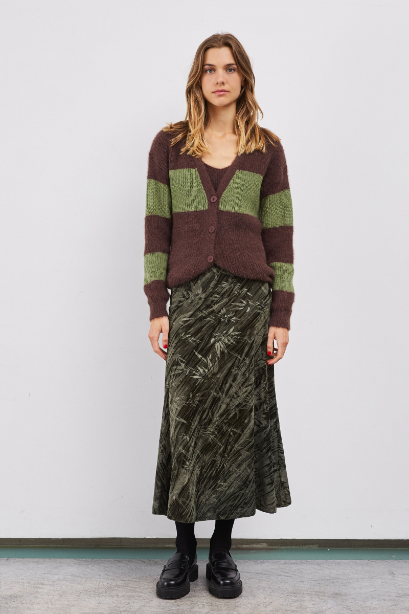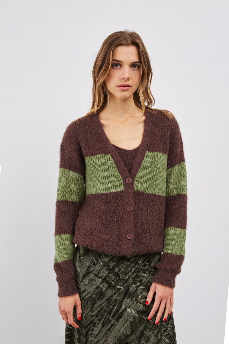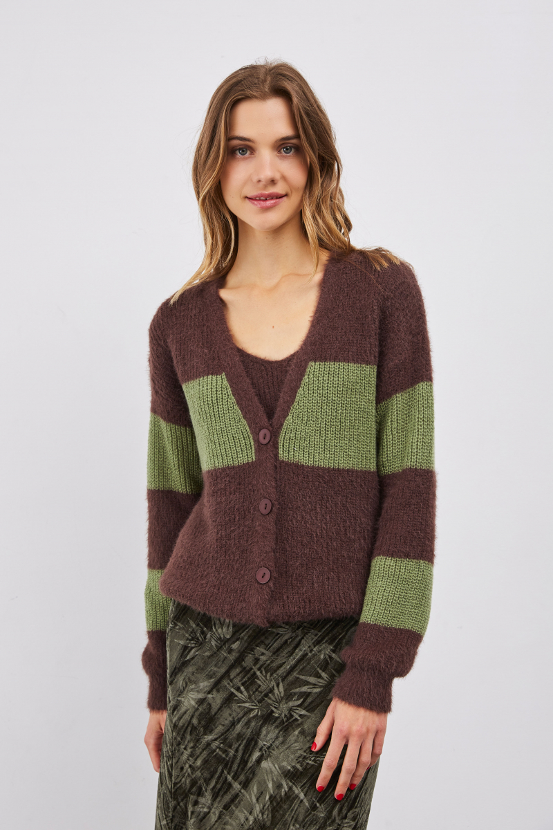 Ce gilet doux et moelleux associe un motif rayé graphique à une coupe confortable et féminine. Il se ferme sur le devant par une rangée de boutons ton sur ton et présente un col V flatteur. Idéal pour superposer sur un t-shirt ou une chemise, il est parfait pour une allure casual-chic en toute saison.