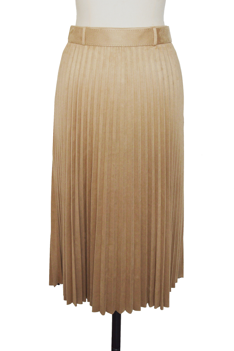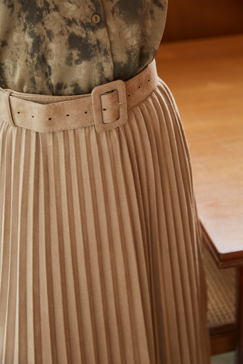 Cette jupe midi adopte une coupe plissée classique et fluide, modernisée par une ceinture ton sur ton à boucle carrée. Sa taille marquée met en valeur la silhouette, tandis que le tissu effet suédine apporte une touche élégante et texturée. Facile à associer avec un chemisier, un pull fin ou un blazer pour des looks aussi bien casual que sophistiqués.