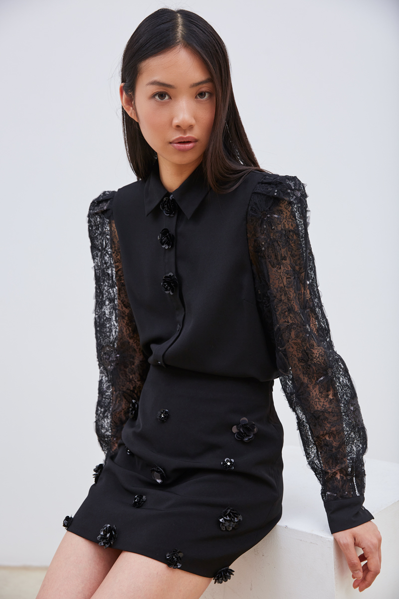 Blouse raffinée et romantique au col montant orné de délicates fleurs brodées et perlées. Les poignets volantés ajoutent une touche de charme vintage, tandis que la coupe fluide assure un confort optimal. Une pièce idéale pour sublimer vos tenues du quotidien ou vos looks plus habillés.