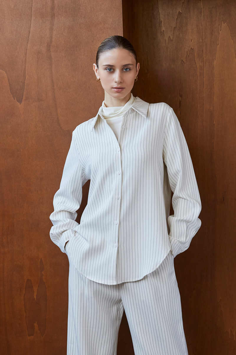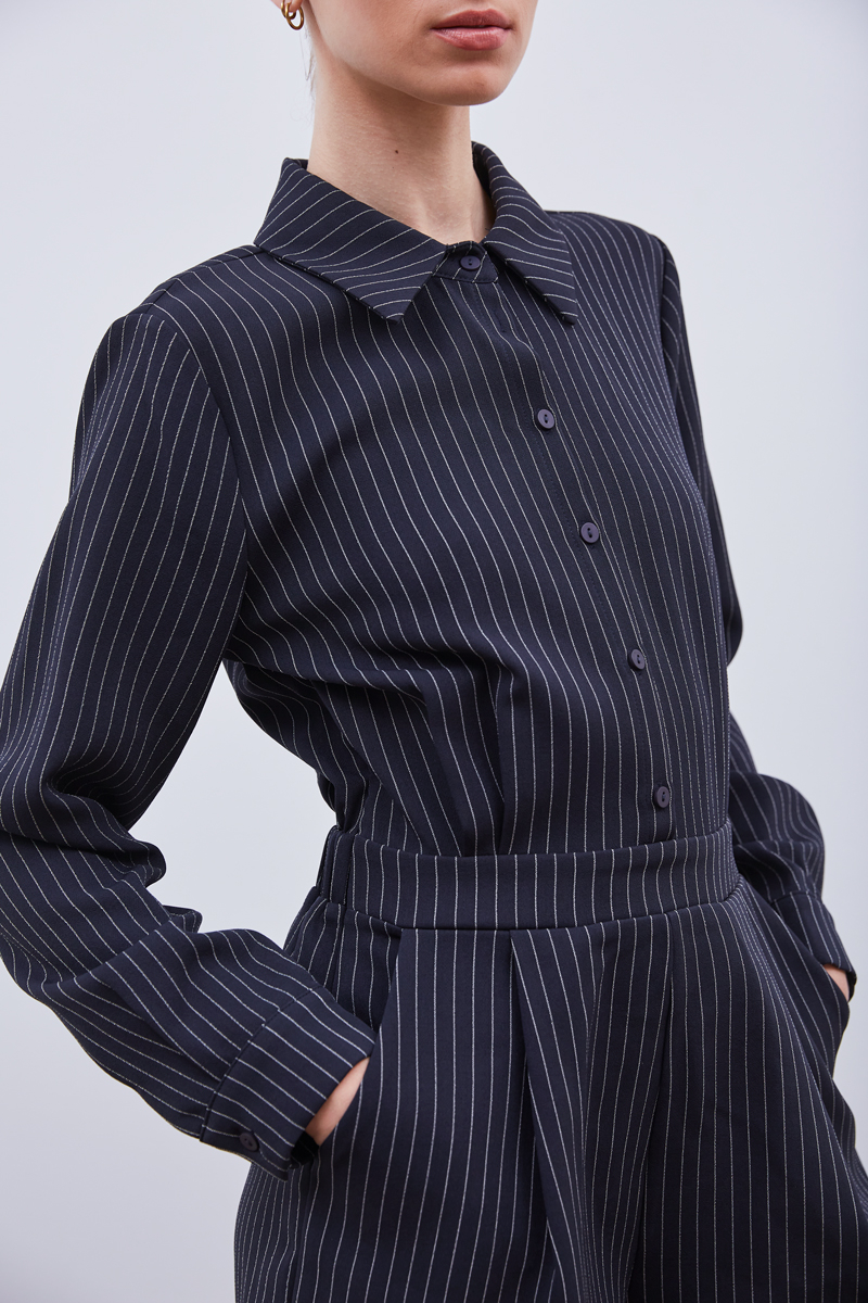 Cette combinaison à manches longues séduit par sa coupe structurée et son imprimé à fines rayures. Parfaite pour un look de bureau moderne ou une sortie urbaine, elle allie confort et élégance grâce à sa taille marquée et son tissu fluide.
