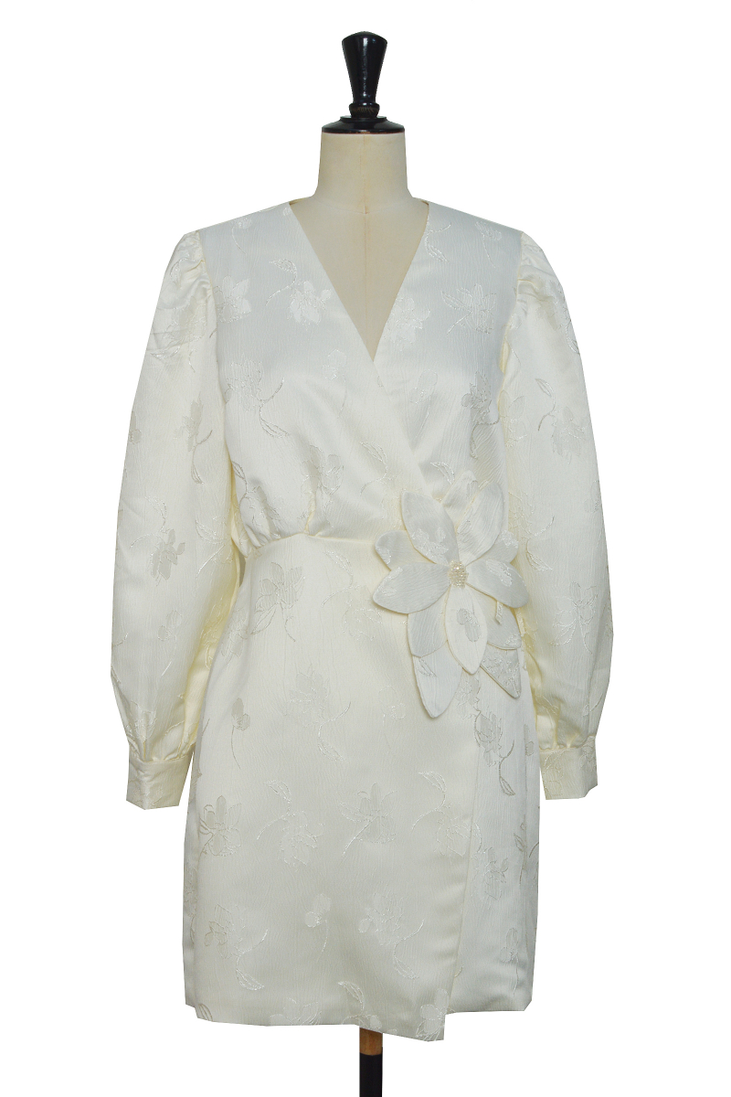 Cette robe courte au charme romantique présente une coupe portefeuille flatteuse soulignée par une ceinture à fleur en relief. Son tissu jacquard floral ton sur ton apporte texture et brillance, tandis que les manches longues bouffantes équilibrent l’ensemble. Une pièce idéale pour les événements festifs ou les dîners habillés.