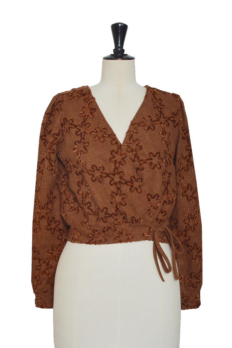 Cette blouse portefeuille à la texture délicatement pailletée est sublimée par des fleurs en relief, apportant une touche romantique et originale. La ceinture à nouer à la taille souligne la silhouette avec féminité. Idéale pour un look élégant et tendance en journée comme en soirée.
