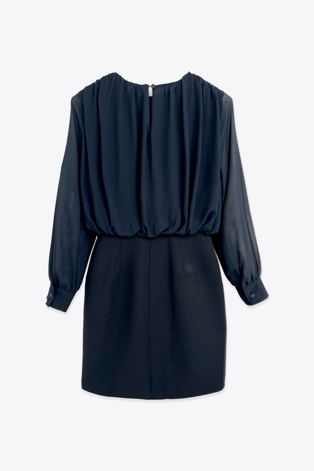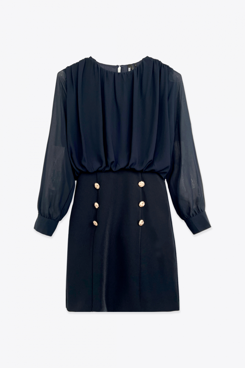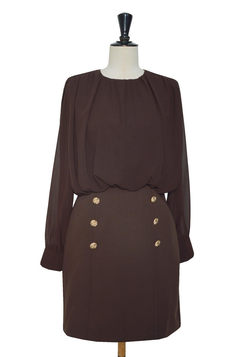 Élégance intemporelle et allure structurée se retrouvent dans cette robe chocolat à manches longues. Son haut légèrement blousant contraste harmonieusement avec une jupe droite à six boutons dorés décoratifs, créant une silhouette moderne et raffinée. Parfaite pour le bureau comme pour une occasion spéciale.