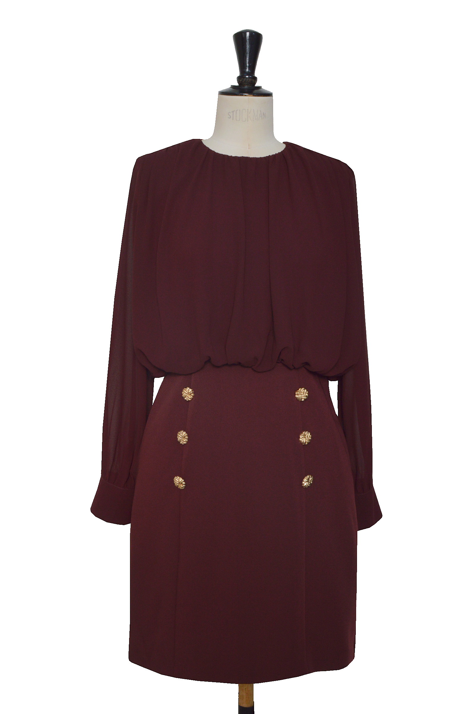 Élégance intemporelle et allure structurée se retrouvent dans cette robe chocolat à manches longues. Son haut légèrement blousant contraste harmonieusement avec une jupe droite à six boutons dorés décoratifs, créant une silhouette moderne et raffinée. Parfaite pour le bureau comme pour une occasion spéciale.