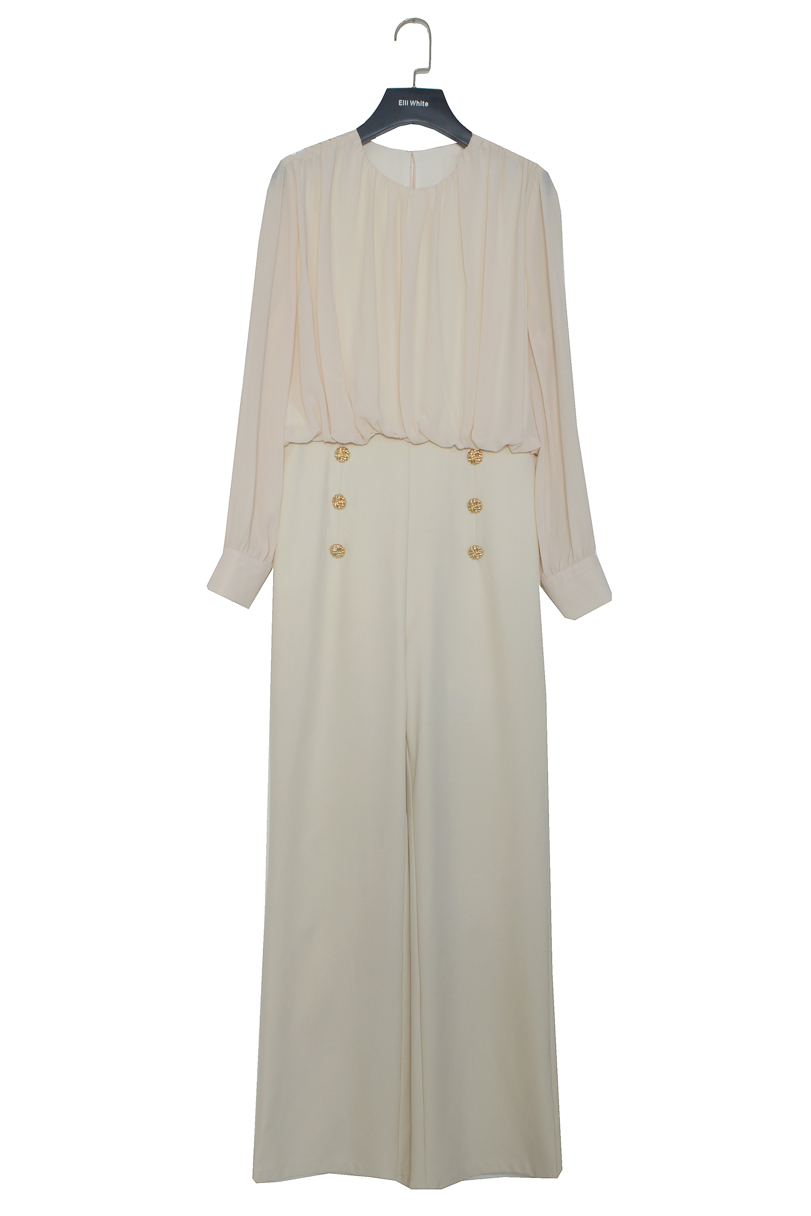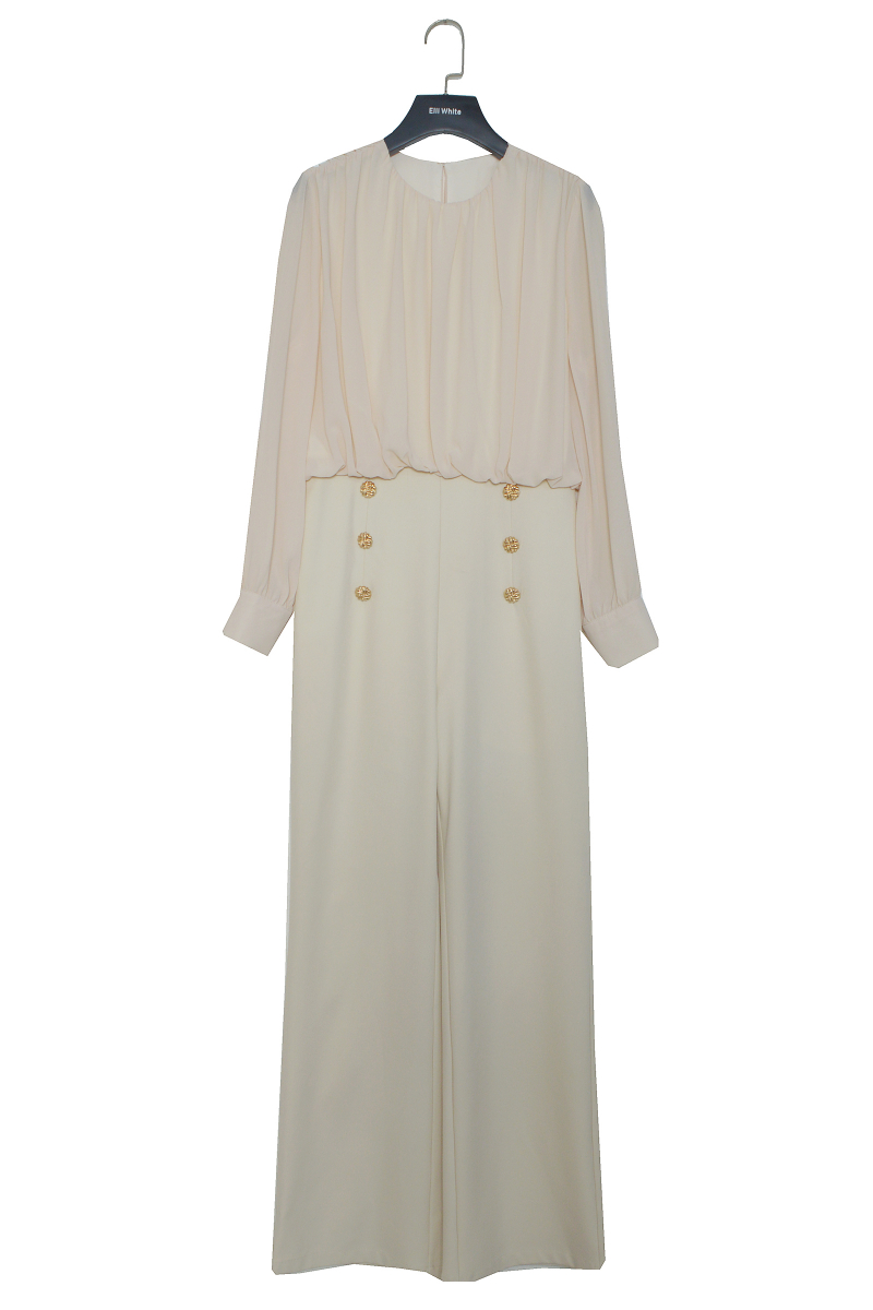 Allure élégante et confort absolu pour cette combinaison au style marin revisité. Son haut fluide blousant contraste parfaitement avec son pantalon droit à taille haute, sublimé par une double rangée de boutons dorés. Une pièce idéale pour une allure chic sans effort.