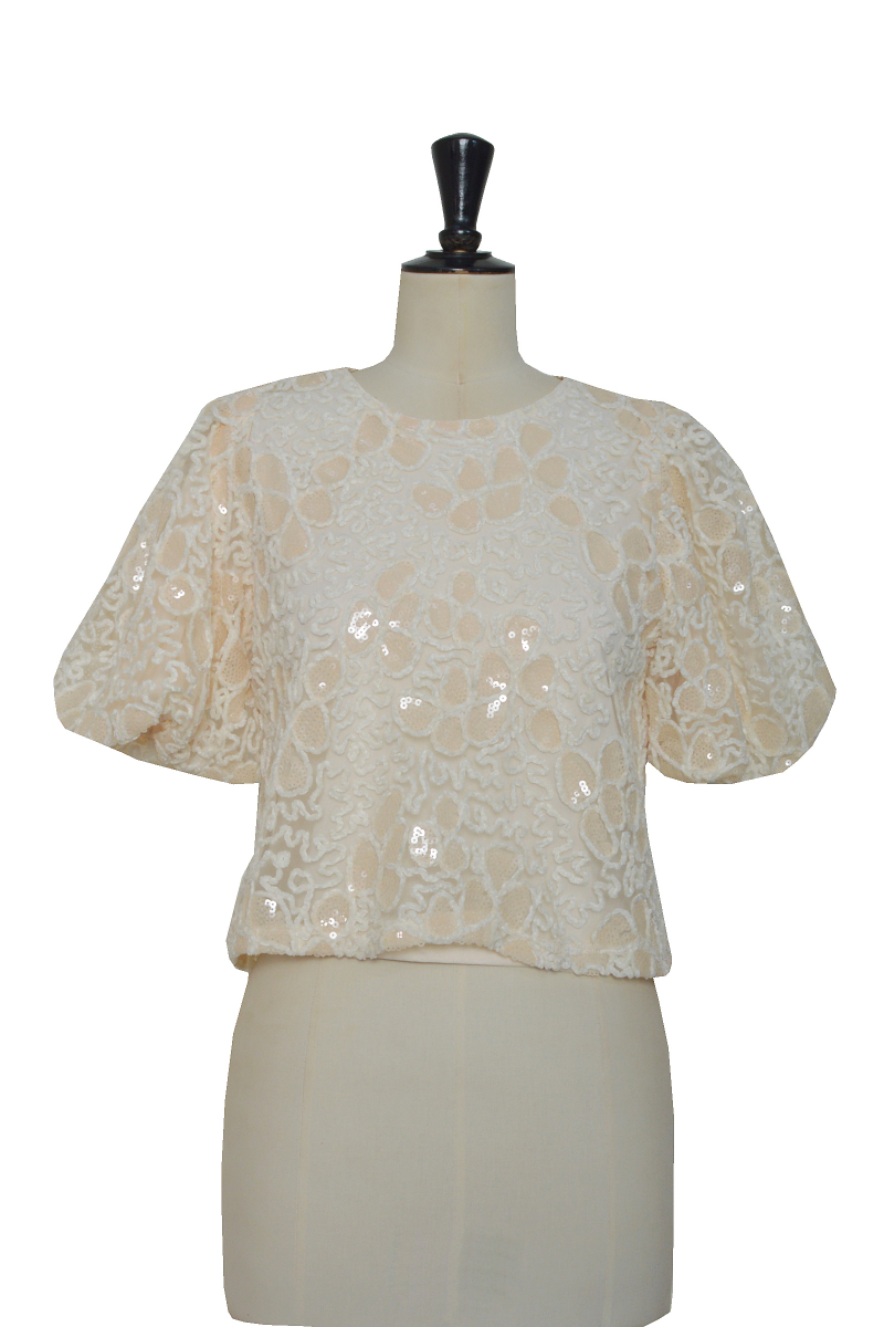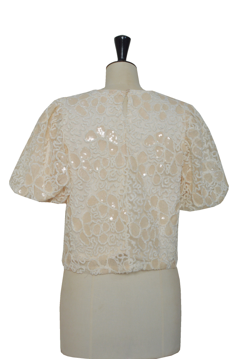 Ce top court séduit par son tissu brodé agrémenté de sequins délicats, offrant un jeu de lumière raffiné. Les manches courtes bouffantes ajoutent du volume et du caractère, tandis que la coupe droite apporte une touche moderne. Le détail du bouton discret au dos complète son allure élégante. Idéal pour illuminer vos tenues de soirée ou apporter une touche sophistiquée à un look plus décontracté.