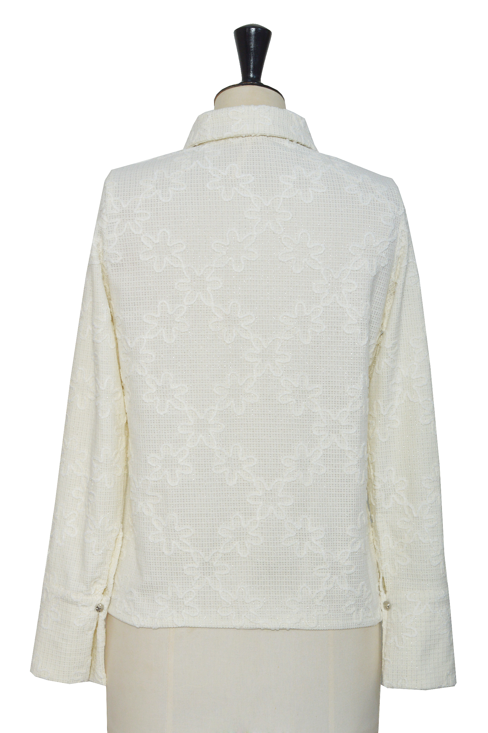 Ce chemisier à manches longues séduit par son tissu délicatement brodé de fleurs en relief et ses détails scintillants discrets. Sa coupe droite, son col chemise classique et ses boutons apparents lui confèrent une allure sophistiquée et féminine.