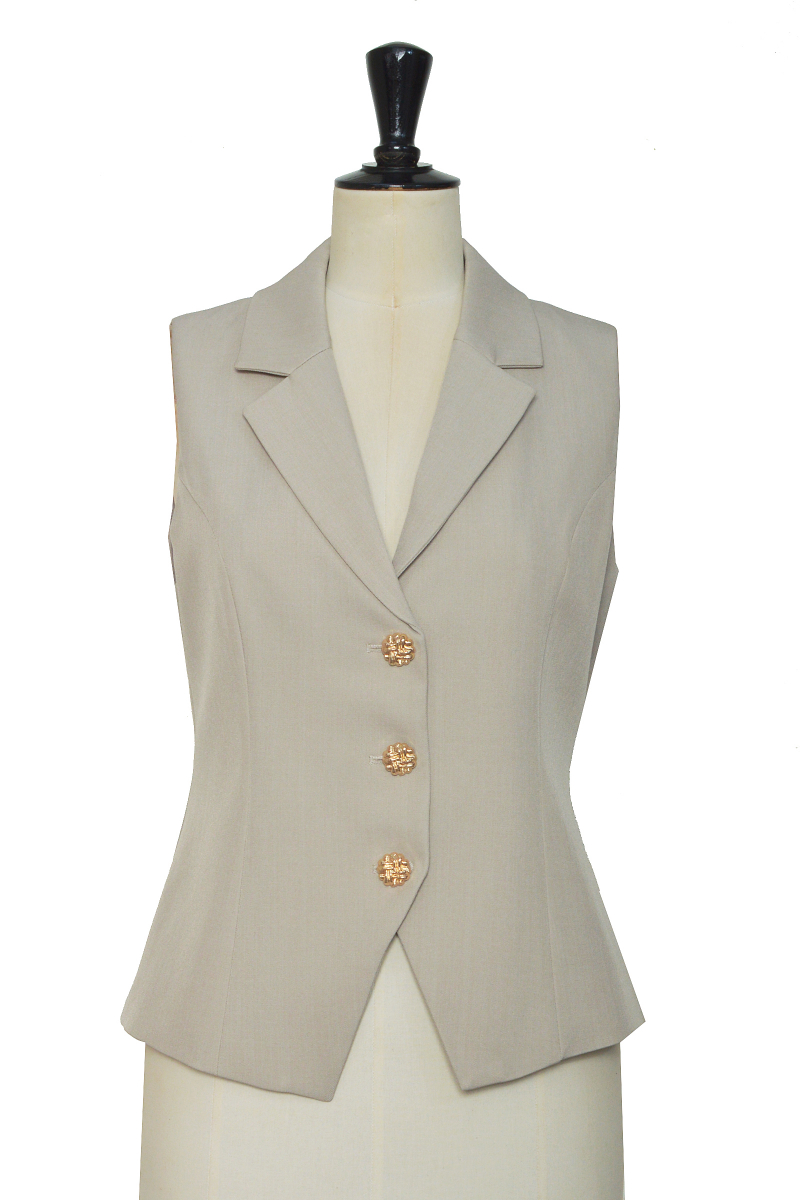 Ce gilet sans manches à col tailleur est une pièce élégante et intemporelle. Sa coupe cintrée met en valeur la silhouette tandis que les boutons dorés lui apportent une touche sophistiquée. Parfait à porter seul ou superposé pour un look chic et structuré.
