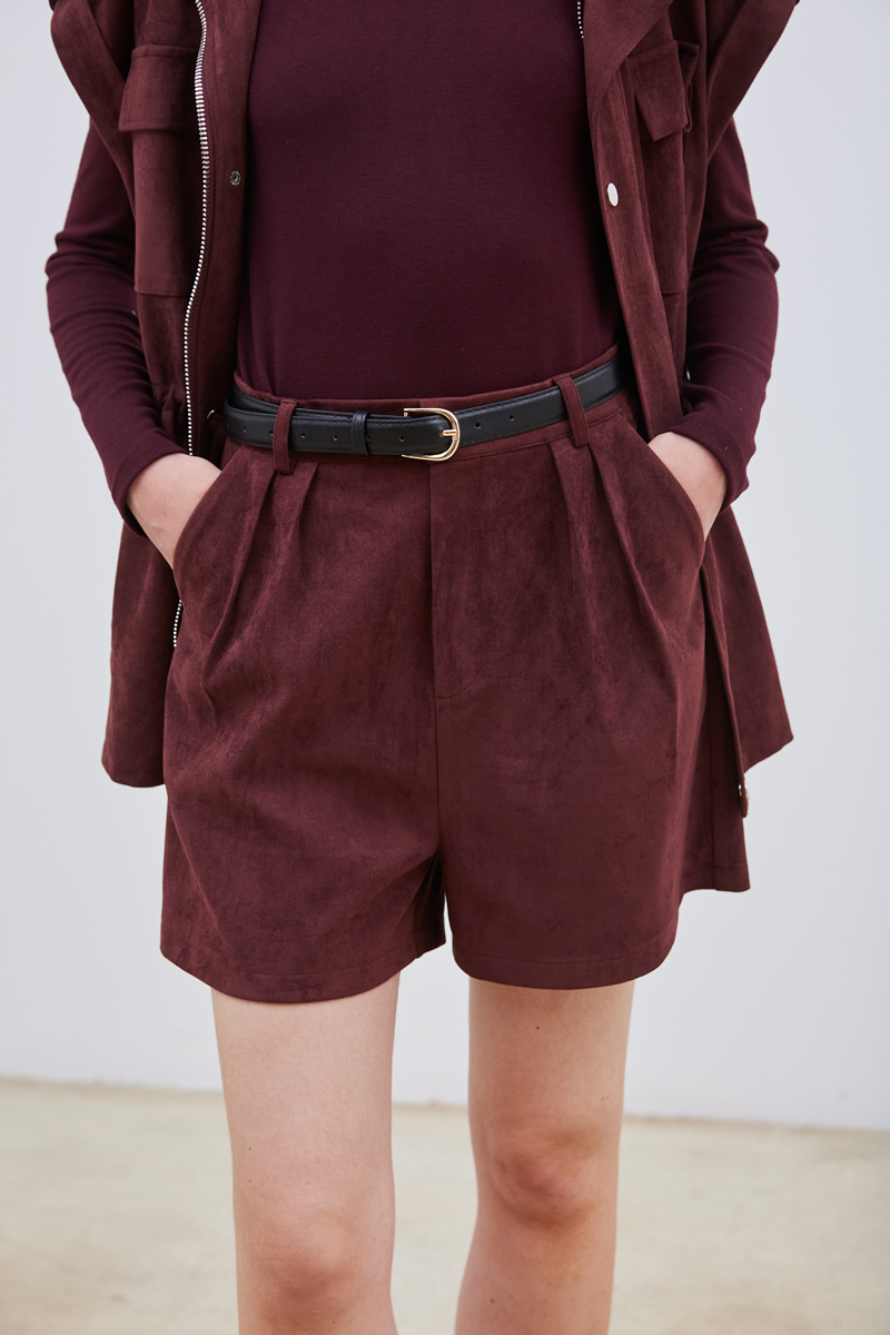 Ce short en suédine prune est une pièce intemporelle et confortable, idéale pour structurer une silhouette avec élégance. Sa coupe droite, ses plis marqués et sa ceinture incluse apportent une touche moderne à cette pièce essentielle.