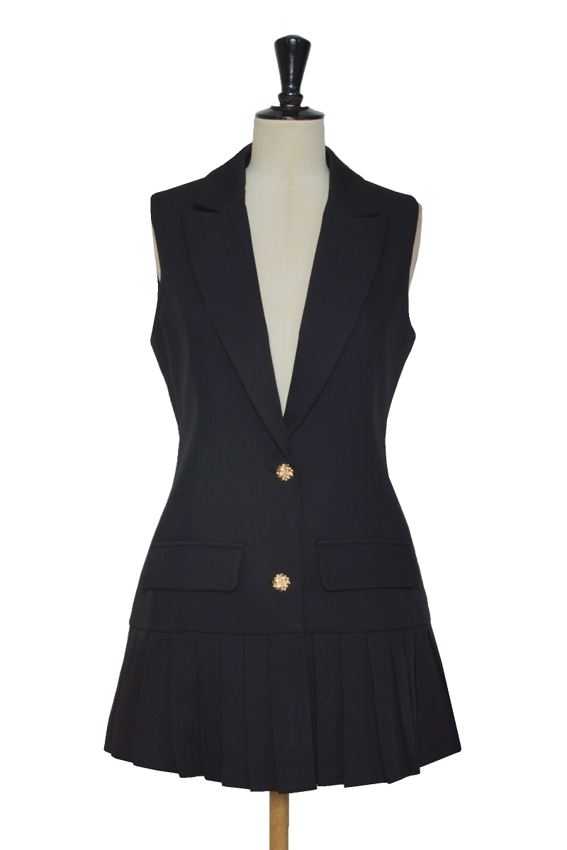 Cette robe blazer sans manches au design tailleur est rehaussée d’un bas plissé façon jupe. Chic et structurée, elle peut se porter seule ou superposée pour une allure sophistiquée.