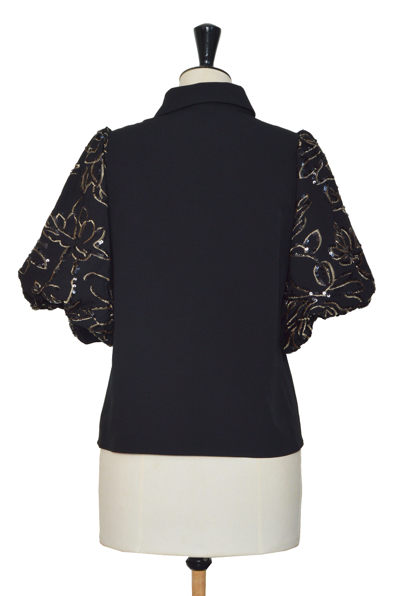 Ce chemisier sophistiqué se distingue par ses manches bouffantes ornées de broderies pailletées, apportant une touche glamour à votre silhouette. Idéal pour vos looks de soirée ou vos tenues de bureau chic.