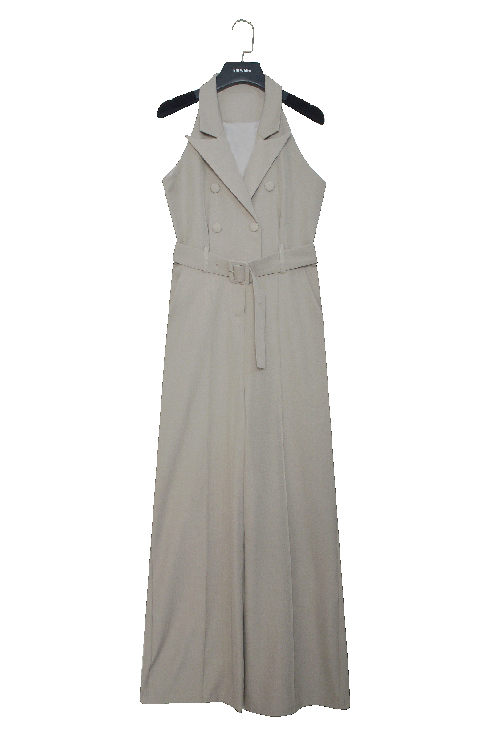Cette combinaison élégante sans manches est dotée d’un col tailleur structuré et d’une double rangée de boutons pour un look affirmé. Sa ceinture ton sur ton permet d’ajuster la taille à votre convenance. Une pièce fluide et chic, parfaite pour des occasions habillées ou un style sophistiqué au quotidien.