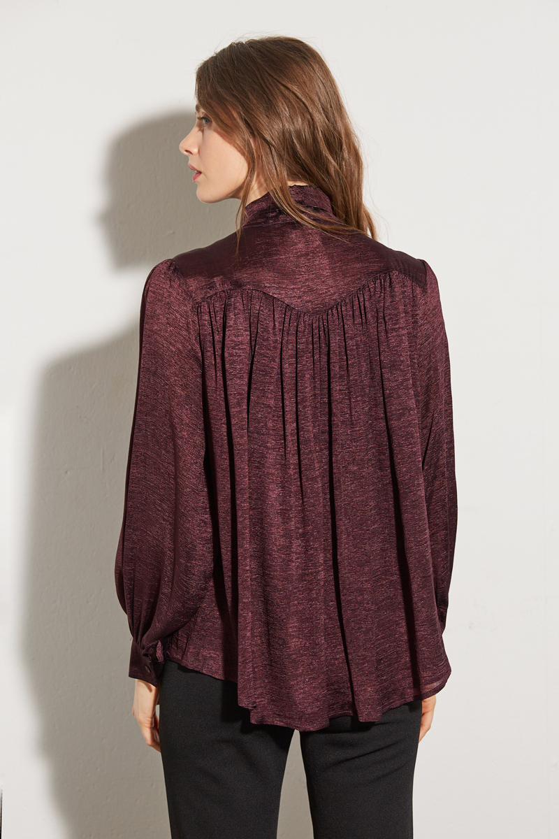 Ce chemisier ample séduit par son tissu satiné texturé et son col lavallière imposant, qui lui donne une allure sophistiquée. Sa coupe fluide et légèrement bouffante offre confort et élégance pour toutes vos occasions, de jour comme de nuit.