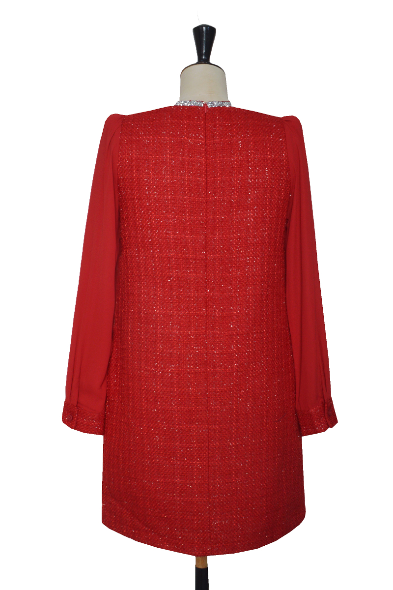 Cette robe droite en tweed brillant séduit par ses détails sophistiqués. Le col rond orné de strass et la goutte élégante sur le décolleté apportent une touche précieuse. Les manches longues en voile léger contrastent délicatement avec la texture du tweed. Deux poches plaquées décorées de galons scintillants soulignent une allure chic et contemporaine. Une pièce idéale pour vos tenues habillées ou vos soirées festives.