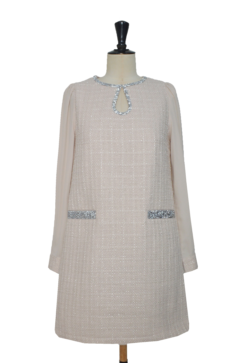 Cette robe droite en tweed brillant séduit par ses détails sophistiqués. Le col rond orné de strass et la goutte élégante sur le décolleté apportent une touche précieuse. Les manches longues en voile léger contrastent délicatement avec la texture du tweed. Deux poches plaquées décorées de galons scintillants soulignent une allure chic et contemporaine. Une pièce idéale pour vos tenues habillées ou vos soirées festives.