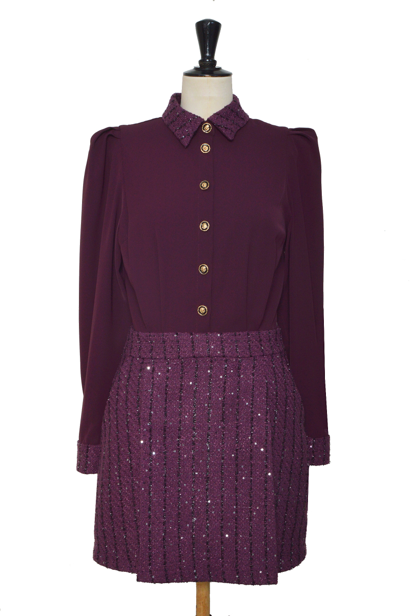 Cette robe courte bicolore joue sur les contrastes entre un haut fluide uni et une jupe structurée en tweed à sequins. Le col chemise et les poignets assortis en tweed scintillant apportent une touche sophistiquée, tandis que les boutons dorés sur le devant renforcent le caractère élégant de la pièce. La silhouette ajustée à la taille souligne la féminité avec discrétion. Un modèle chic et lumineux, parfait pour des événements ou une tenue de soirée moderne.