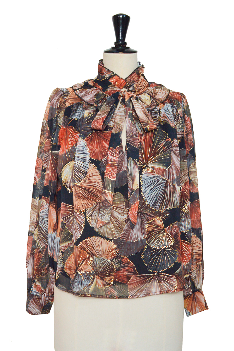 Blouse fluide imprimée à col lavallière et finitions volantées