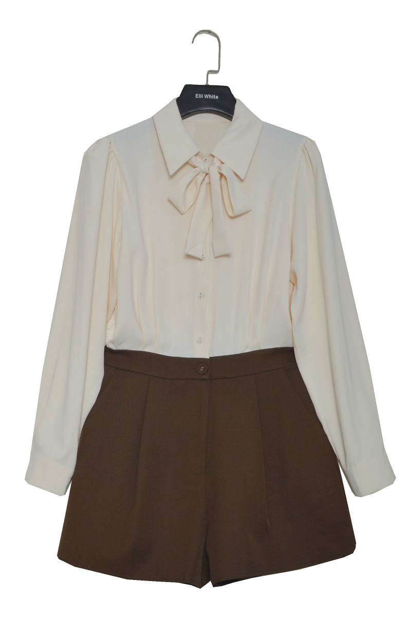 Cette combinaison courte revisite l’allure tailleur avec modernité. Le haut chemise fluide à manches longues est souligné par un élégant nœud lavallière contrasté, tandis que le short à pinces apporte une structure raffinée. La taille est légèrement élastiquée dans le dos pour un confort optimal. Une pièce idéale pour composer une silhouette chic en toute simplicité.