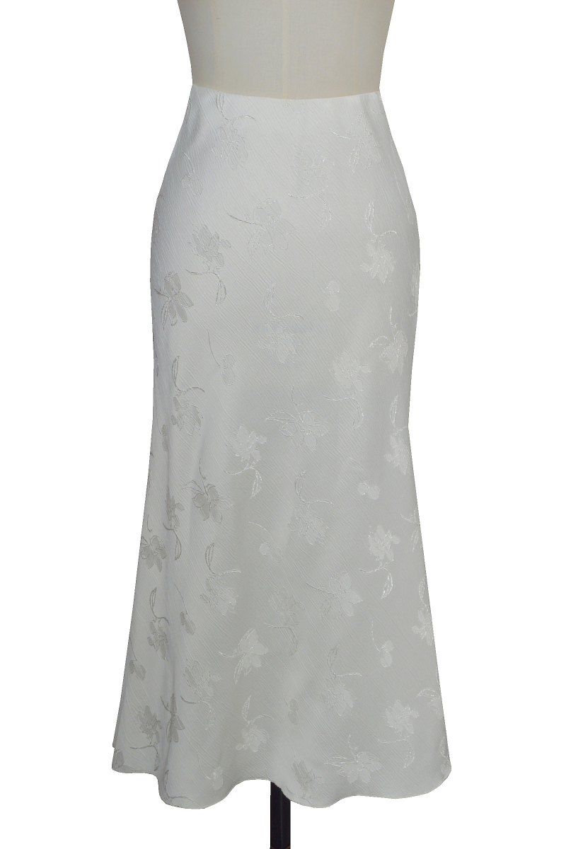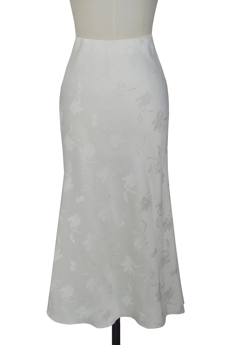 Cette jupe midi séduit par sa fluidité et la finesse de son motif jacquard ton sur ton. Sa coupe évasée épouse délicatement les formes sans marquer, tandis que la taille haute allonge la silhouette. Une pièce intemporelle à porter avec un top habillé ou un chemisier fluide.