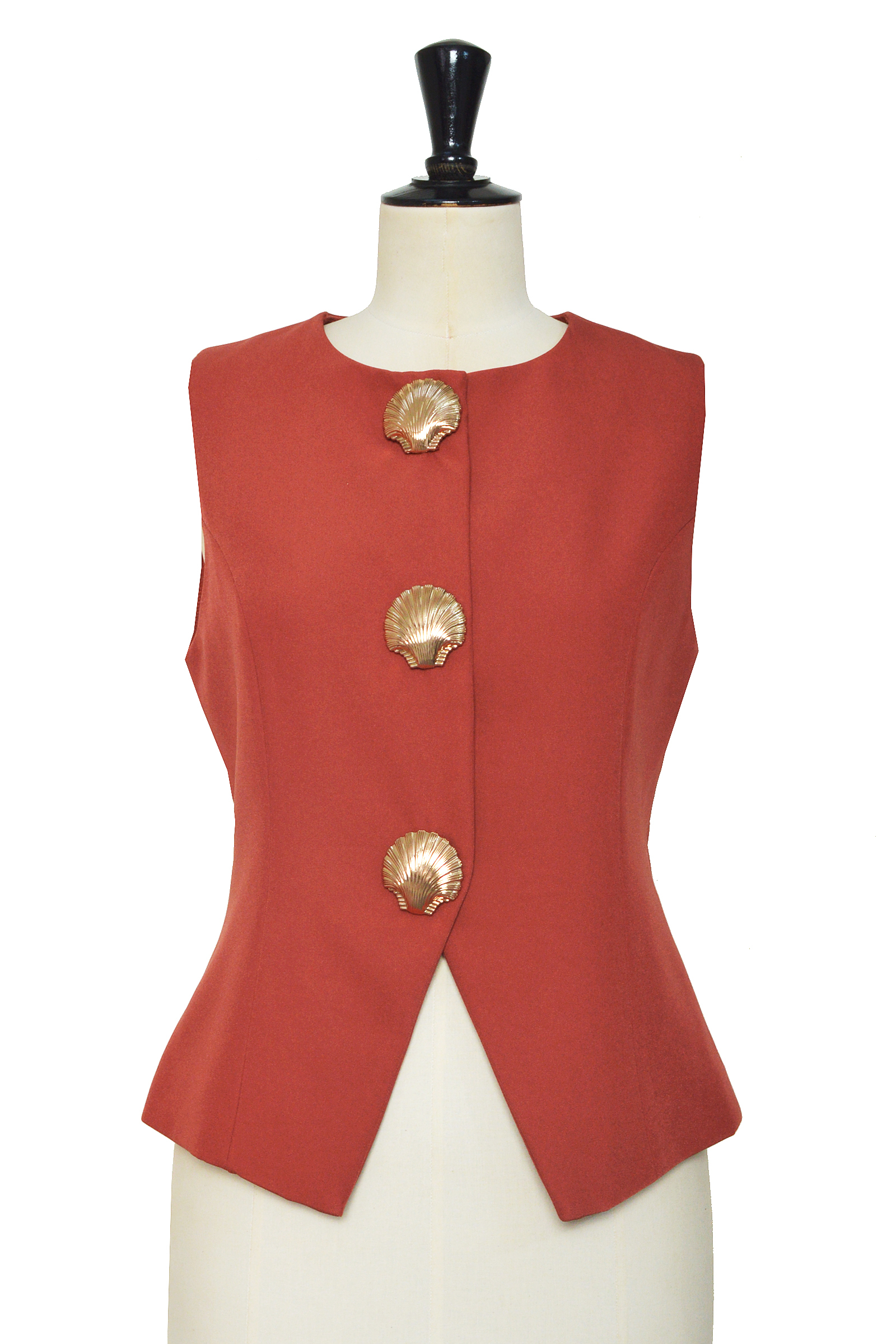 Ce gilet sans manches allie modernité et élégance avec sa coupe ajustée et ses boutons dorés en forme de coquillage qui attirent le regard. La structure près du corps met en valeur la silhouette tout en restant confortable. À porter seul pour un look affirmé ou superposé sur une chemise ou un sous-pull pour une allure sophistiquée.