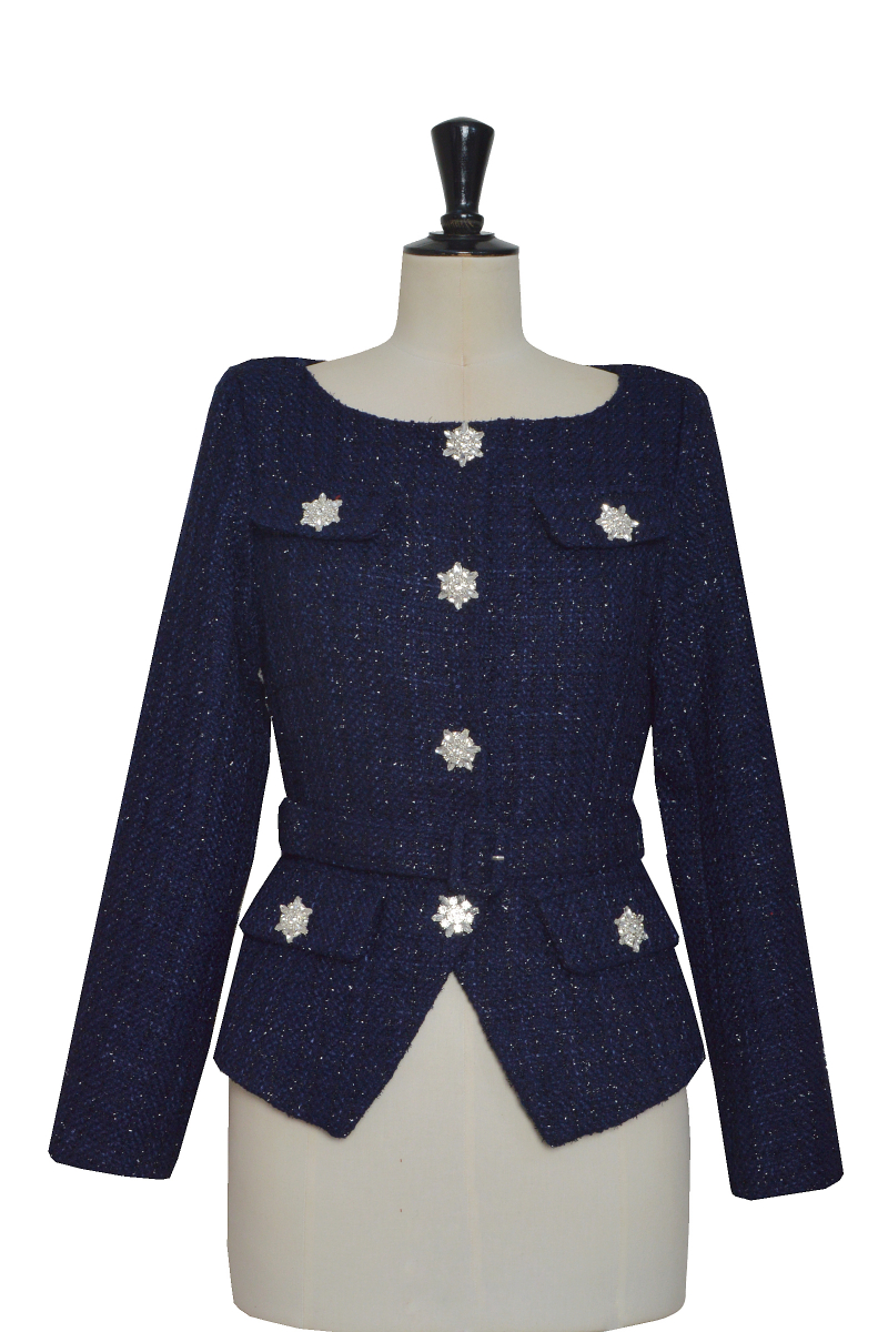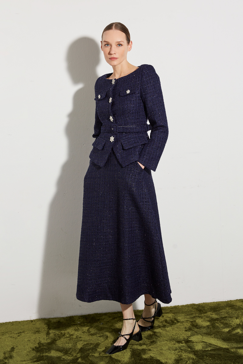 Cette veste en tweed structurée revisite les codes classiques avec élégance. Sa coupe cintrée est sublimée par une ceinture assortie qui marque la taille. Les boutons bijoux effet cristal ajoutent une touche lumineuse et précieuse à la silhouette. Un col carré raffiné et des poches à rabat complètent ce modèle habillé, idéal pour vos looks chics et féminins.
