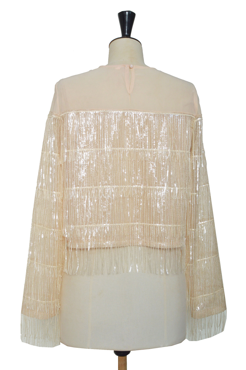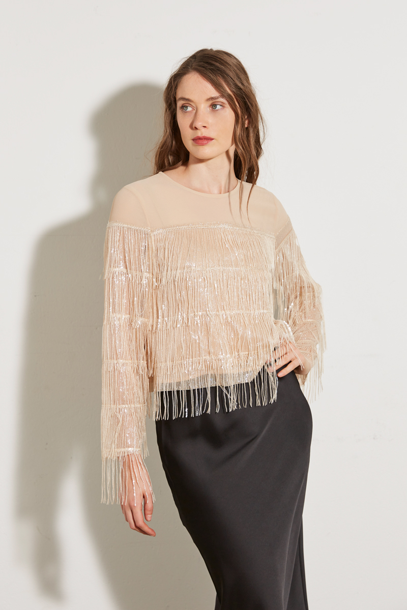 Ce top au design spectaculaire associe sequins brillants et franges dynamiques pour un effet de mouvement à chaque pas. L'empiècement en voile transparent sur les épaules apporte une touche de légèreté, contrastant avec le corps entièrement orné. Les manches longues et la coupe droite en font une pièce forte à porter en soirée ou lors d’occasions festives.
