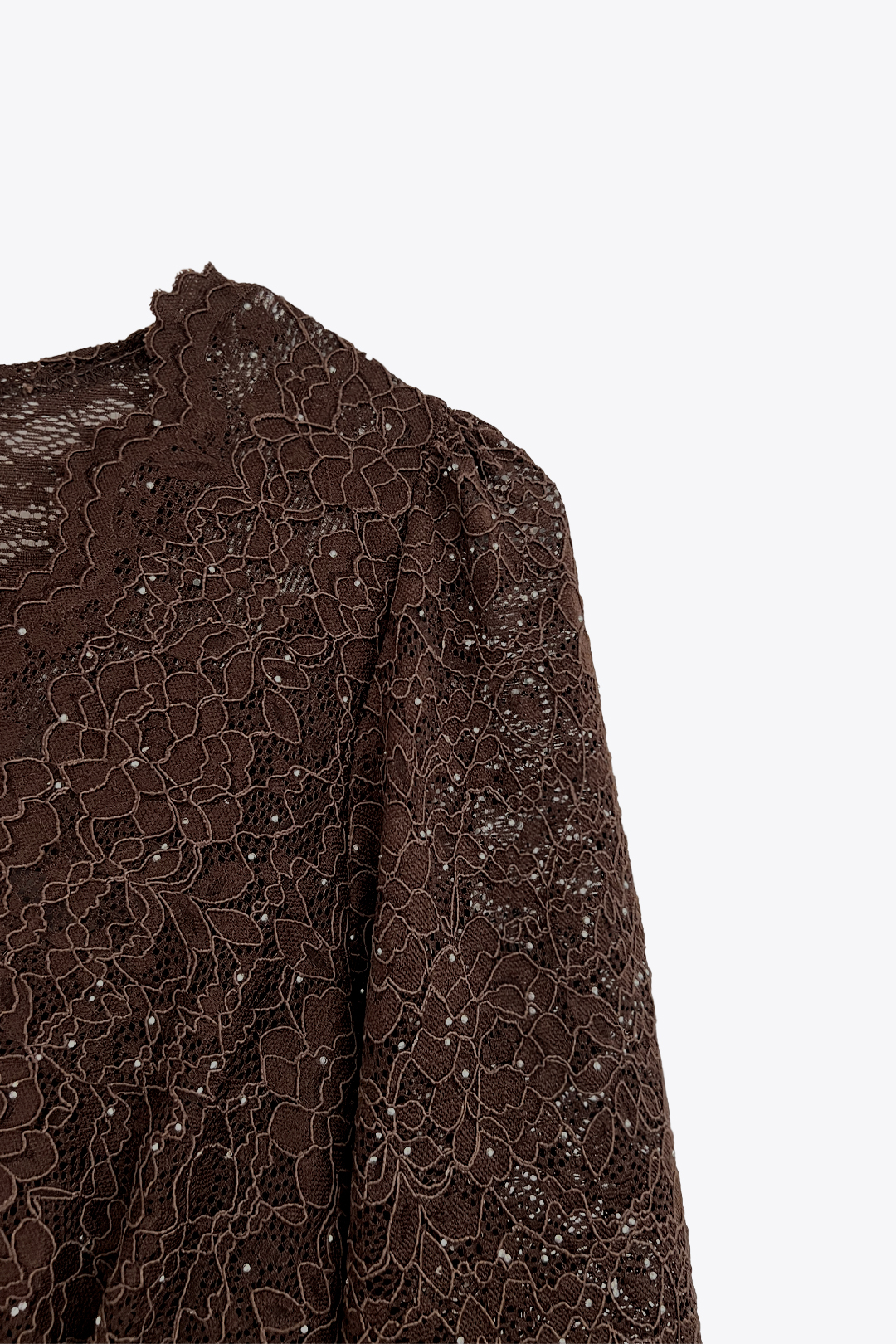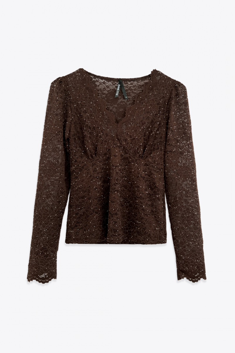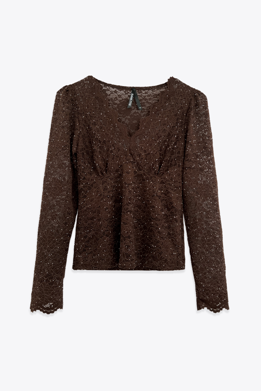 Ce haut ajusté en dentelle florale dévoile subtilement la silhouette tout en restant élégant et féminin. Son encolure en V festonnée apporte une touche raffinée, tandis que les manches longues transparentes équilibrent la sensualité de la coupe. Un modèle idéal pour composer une tenue habillée ou sophistiquée, à porter seul ou sous une veste.