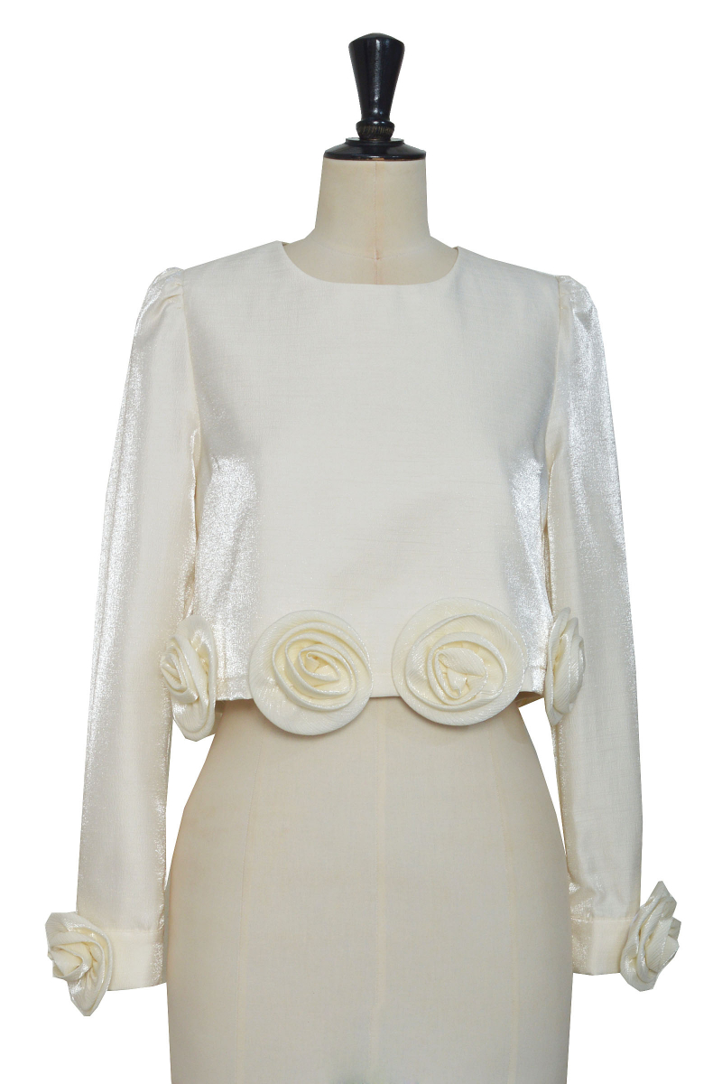 Ce top élégant associe une coupe minimaliste à des détails sophistiqués. Sa ligne droite et épurée est sublimée par de larges ornements floraux contrastés placés à la taille et aux poignets, apportant une touche couture et féminine. La fermeture discrète au dos assure un porté raffiné et confortable. Une pièce distinctive, idéale pour des occasions habillées.